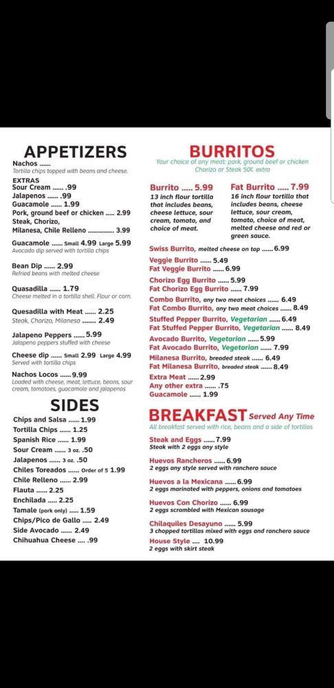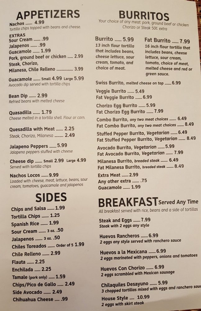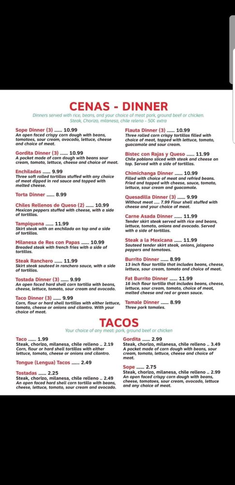 Filled with choice of meat and refried beans, fried and topped with cheese, sauce, tomato, lettuce, sour cream and guacamole.