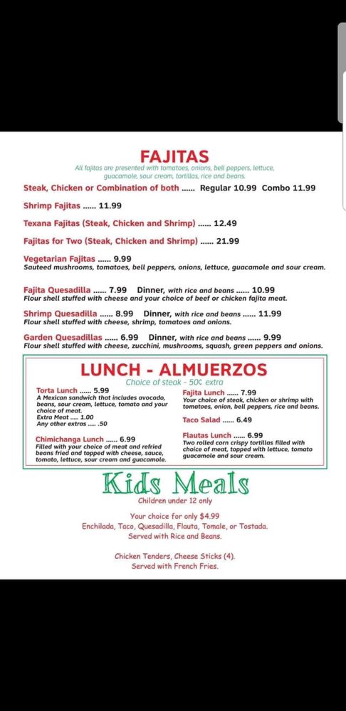 Flour shell stuffed with cheese and your choice of beef or chicken fajita meat. Served with rice and beans.