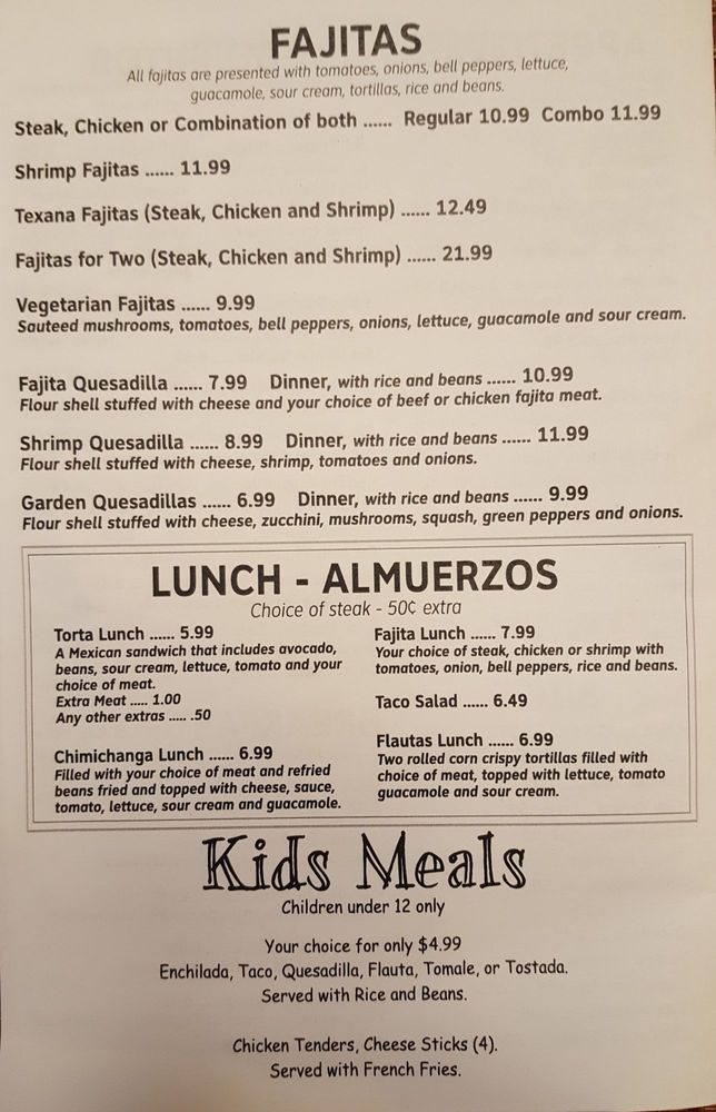 Steak Fajita Dinner: Sizzling steak strips, bell peppers, onions. Choice of corn or flour tortilla.